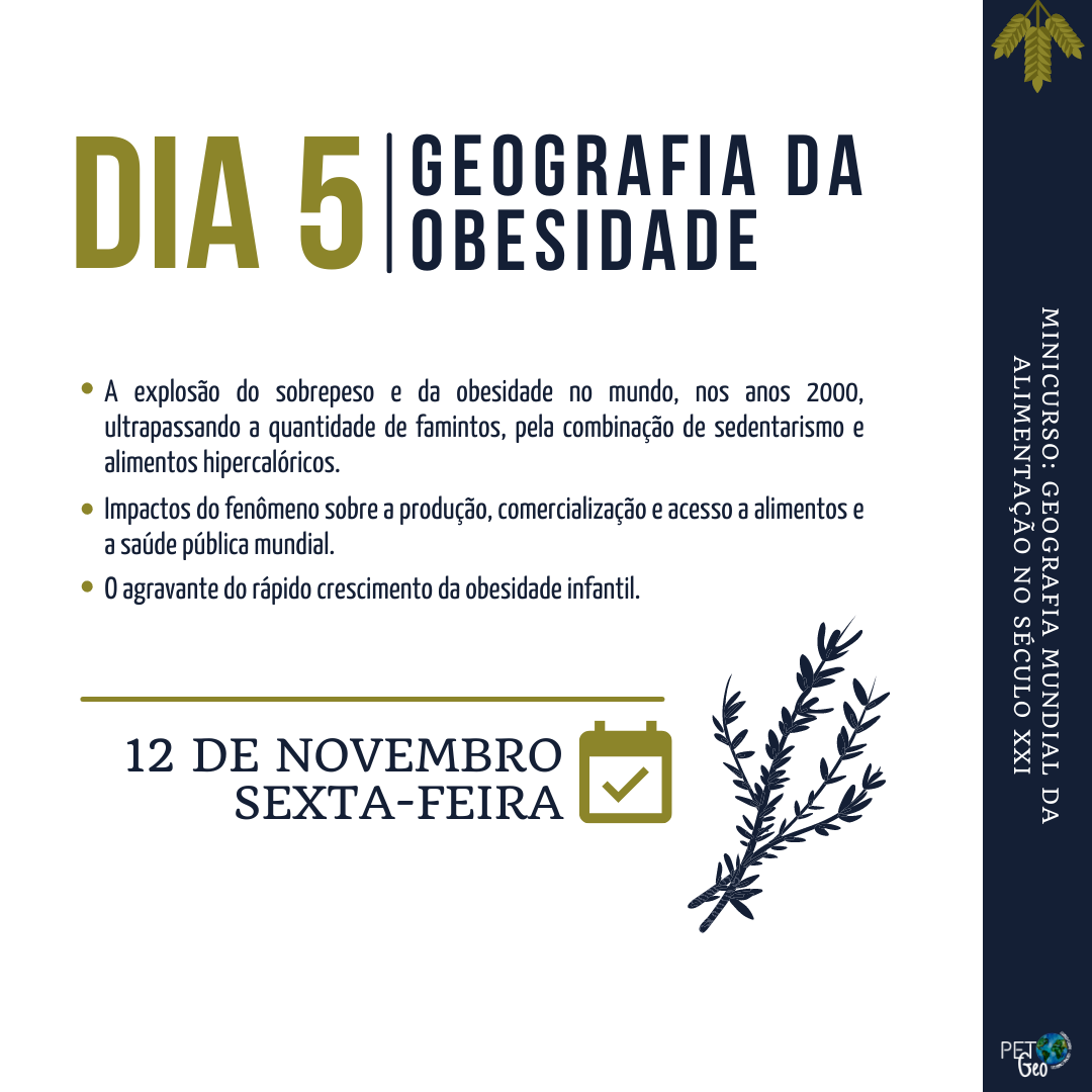 Dia 5 – Geografia da Obesidade: a explosão do sobrepeso e da obesidade no mundo, nos anos 2000, ultrapassando a quantidade de famintos, pela combinação de sedentarismo e alimentos hipercalóricos. Impactos do fenômeno sobre a produção, comercialização e acesso a alimentos e a saúde pública mundial. O agravante do rápido crescimento da obesidade infantil.