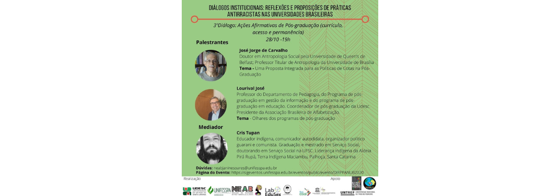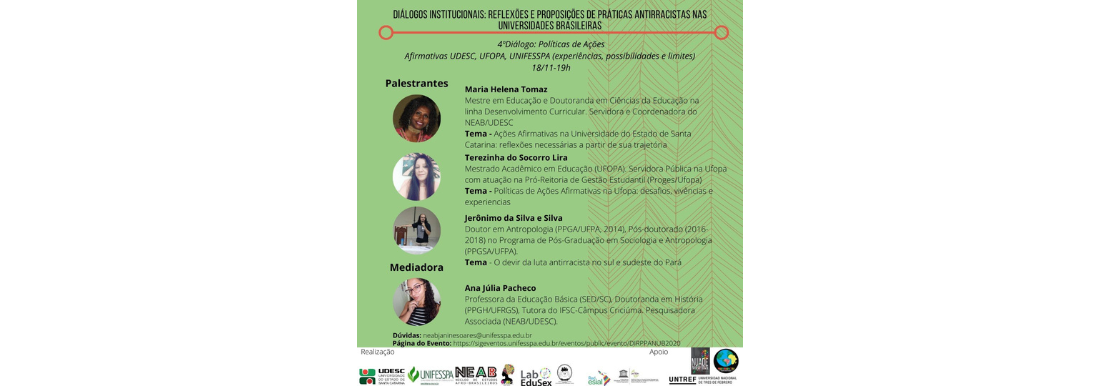 O I Seminário online “Diálogos institucionais: reflexões e proposições de práticas antirracistas nas universidades brasileiras”, em formato onlinerealizado em 2020, destacou a temática o combate ao racismo nas universidades brasileiras, pensando as políticas de ações afirmativas adotadas pela Universidade do Estado de Santa Catarina-UDESC, Universidade Federal do Sul e Sudeste do Pará-Unifesspa, Universidade Federal do Oeste do Pará-UFOPA e outras. O presente evento é uma iniciativa de pesquisa, oriundo de um acordo de Cooperação Técnico-Científica entre a UDESC e a Unifesspa.