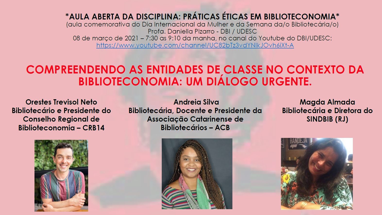 Participarão do debate o bibliotecário da Udesc, Orestes Trevisol Neto, atual presidente do Conselho Regional de Biblioteconomia (BRB14); a bibliotecária e professora da Udesc Faed, Andreia da Silva, atual presidente da Associação Catarinense de Bibliotecários (ACB); e a bibliotecária Magda Almada, diretora do Sindicato dos Bibliotecários (SindBib) do estado do Rio de Janeiro.