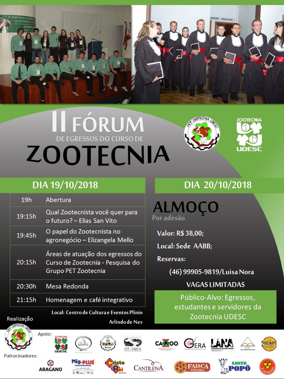 2º Fórum de Egressos, com uma série de atividades, incluindo três palestras, uma mesa-redonda e homenagens pelos dez anos de formatura das duas primeiras turmas, no dia 19, a partir das 19h, no Centro de Cultura e Eventos Plínio Arlindo de Nes.