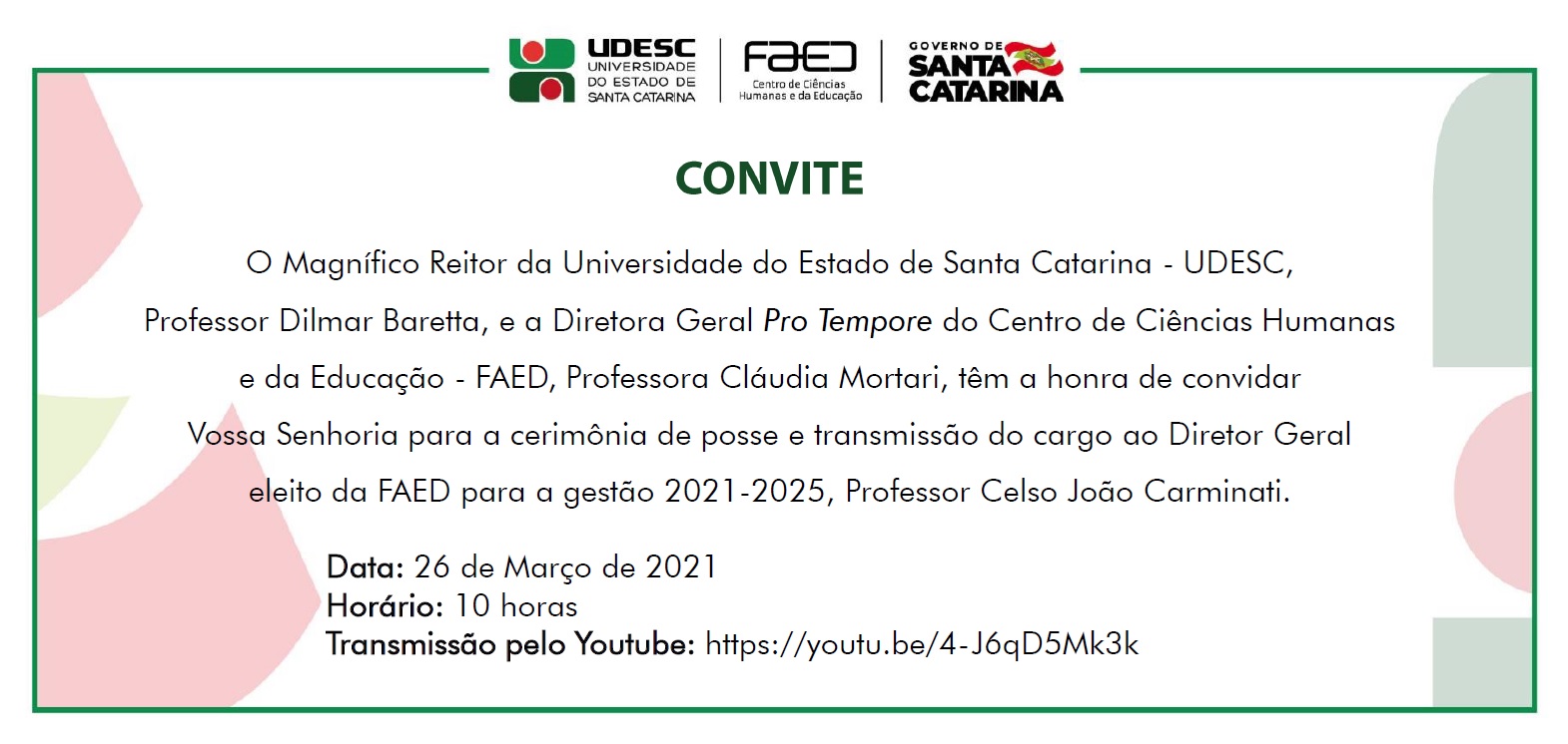 “Nesses tempos difíceis de pandemia em que as pessoas estão passando por muitas dificuldades econômicas, emocionais e sanitárias, queremos manifestar nossa solidariedade à todas as famílias que estão perdendo seus parentes e amigos e pedir a toda comunidade faediana, para que cuidem-se, ainda mais, pois o contágio aumentou muito nas últimas semanas. Gostaria de agradecer imensamente a todos e todas pela confiança e convidar docentes, técnicos e técnicas para unir forças e continuar fazendo o melhor pelos nossos estudantes, pois estes são a razão do nosso trabalho. Daremos continuidade às ações da atual gestão, avaliando e definindo ações a curto e médio prazo para fortalecer as atividades do Centro, especialmente os setores que estão sobrecarregados em decorrência das atividades remotas e do teletrabalho”, declarou Carminati.