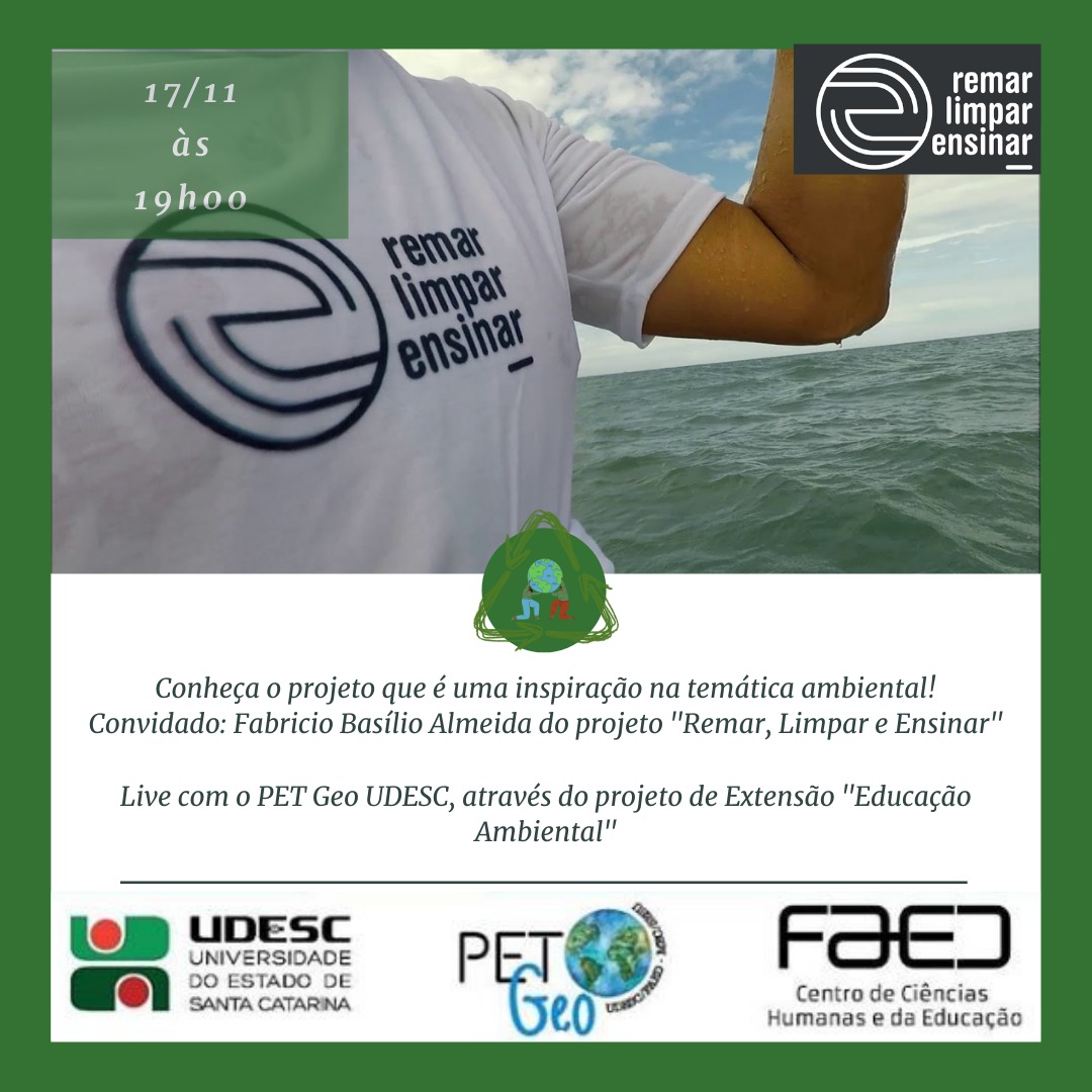 A atividade virtual contará com a participação de Fabrício Basílio Almeida, integrante do projeto “Remar, Limpar e Ensinar”, do Instituto Aprender Ecologia, de Florianópolis. A entidade trabalha com a temática ambiental e venceu um prêmio europeu internacional em 2020, onde cerca de 180 projetos do mundo todo concorriam para ganhar recursos financeiros para realização de suas atividades.