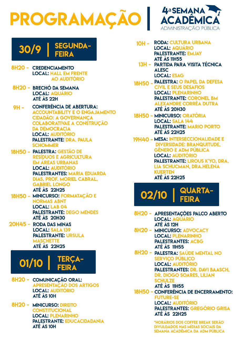 Os eventos da semana continuam à noite, a partir das 18h50, com palestra sobre “Gestão de Resíduos e Agricultura em Áreas Urbanas”, minicurso de “Formatação e Normas ABNT” e a “Roda das Minas”. Na terça, 1º de outubro, a programação começa às 8h20, com apresentações de artigos e minicurso sobre “Direito Constitucional”.