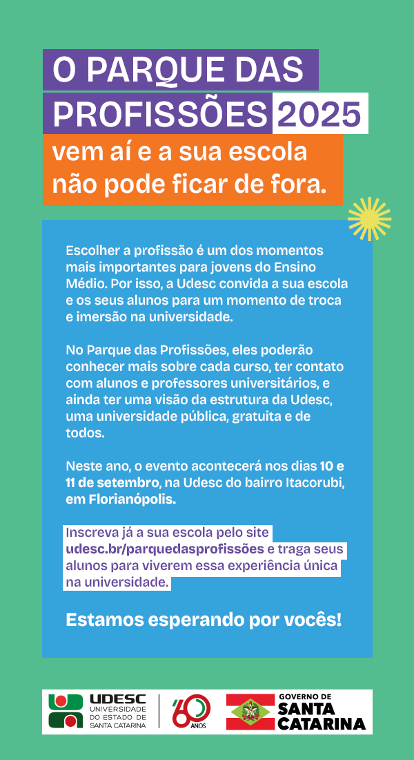 O Parque das Profissões 2025 acontece nos dias 10 e 11 de setembro, no campus-sede da Udesc, no bairro Itacorubi, em Florianópolis. As atividades são gratuitas e ocorrem nos dois dias das 8h às 12h e das 13h30 às 18h.
