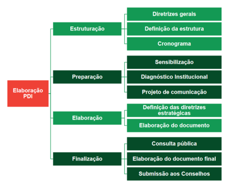 No organograma abaixo, fica estabelecido quatro etapas de elaboração do PDI, consistindo de sua estruturação, preparação, elaboração e finalização. Espera-se, com essa organização, atingir o objetivo de criação deste importante instrumento de planejamento.