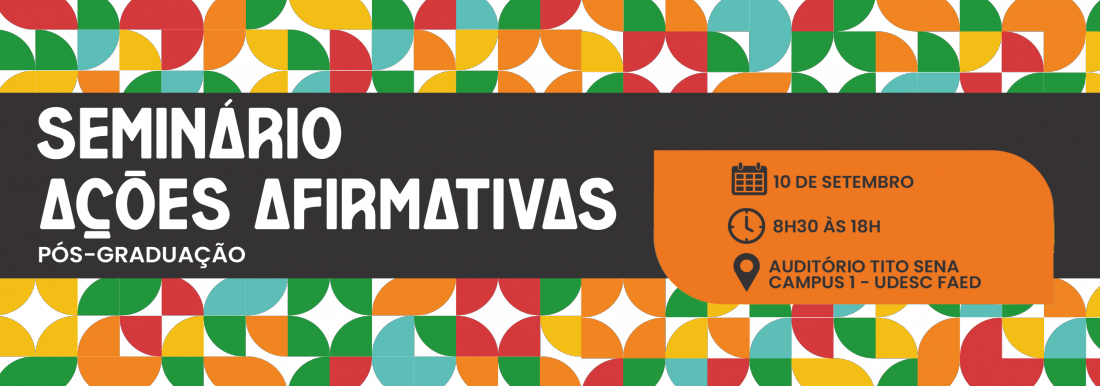 No dia 10/09, acontecerá no auditório da FAED, o Seminário de Ações Afirmativas na Pós-Graduação. Palestrantes convidados externos compartilharão suas perspectivas, neste evento que será dedicado a discutir o papel das políticas afirmativas na promoção da diversidade, equidade e inclusão na Pós-Graduação da UDESC.