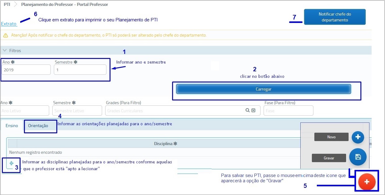 >> Planejamento No SIGA: Acesse o menu "PTI", item de menu "Planejamento de PTI" e observe na imagem abaixo a sequência dos números (1 - 7)